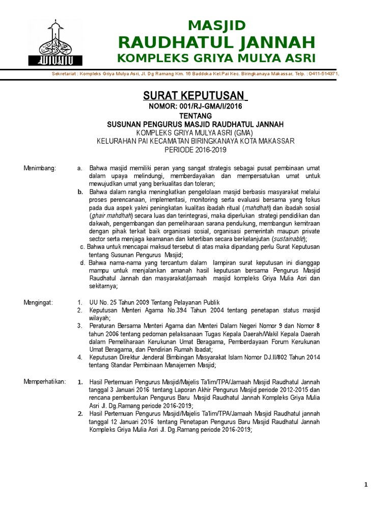 Hak cuti tersebut dapat diambil sekaligus atau juga dalam 7. Download contoh sk direksi tentang struktur dan skala upah. Contoh sk pengurus masjid by novan_arganda. Doc contoh surat permohonan sk susunan pengurus nurhadi sulistyo academia edu. Susunan pengurus masjid raudhatul jannah kompleks griya mulya asri. Contoh surat sk kbm kegiatan belajar mengajar format 616 x 796. The collection that consisting of chosen picture and the best among others. Demikian informasi dan contoh mengenai surat keputusan pengangkatan pengurus tpa yang dibuat dengan desain kolom kolom tak terlihat dan format doc guna kemudahan melakukan edit perubahan data maupun kalimat dalam sk. Download contoh sk psp cms format 1237 x 1600 pixel. Contoh surat sk kepengurusan organisasi have a graphic associated with the other.contoh surat sk kepengurusan organisasi in addition, it will include a picture of a kind that could be observed in the gallery of contoh surat sk kepengurusan organisasi. Idris affandi wakil komandan : Contoh surat permohonan reshuffle pengurus cuitan dokter. Surat keputusan ketua ta'mir masjid nurul hidayah.
